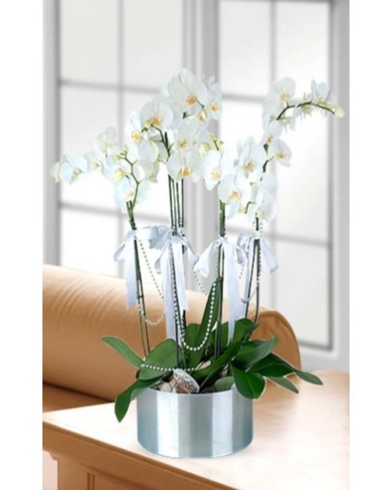 Yaklaşık 70 cm boyunda 5 dal beyaz orkide, seramik vazo içerisinde bulunmaktadır. Güzel orkideler ile yapılmış anlamlı bir aranjman, göz alıcı güzelliği ile sevdiklerinizin kalbine giden yoldur. Egzotik çiçeklerden olan orkide, hava süzülüyormuş gibi görünen zarif çiçekleri ile bulunduğu ortamı güzelleştiren yegane bir çiçek türüdür. 5 dal beyaz taze ve tomurcuklu orkidenin bulunduğu ortamın havasını değiştirip, ortama güzel bir sinerji yayması kaçınılmazdır.