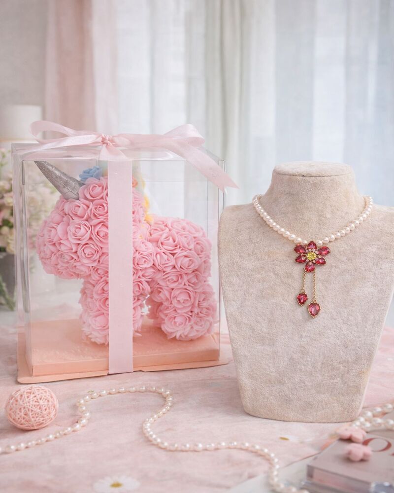 Hayal gücünüzü ve zarafetinizi bir araya getiren bu özel set, gerçek inci kolye, pembe solmayan gül ve sevimli unicorn figürü ile tamamlanıyor. Her parça özenle seçildi, uzun ömürlü ve göz alıcı bir tasarım sunuyor.