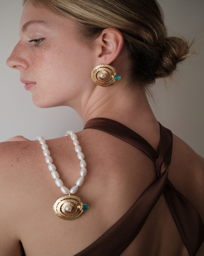 Sally Jewels’in özenle tasarladığı bu zarif kolye, tamamı gerçek arpa incilerle hazırlanmış olup ucunda 24 ayar altın kaplama, mavi taş detaylı dpiralcharm ile tamamlanmıştır. İncelikle dizilmiş doğal inciler ve anlam taşıyan charm detayı sayesinde hem günlük kombinlerinize hem de özel anlarınıza sofistike bir dokunuş katar.