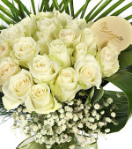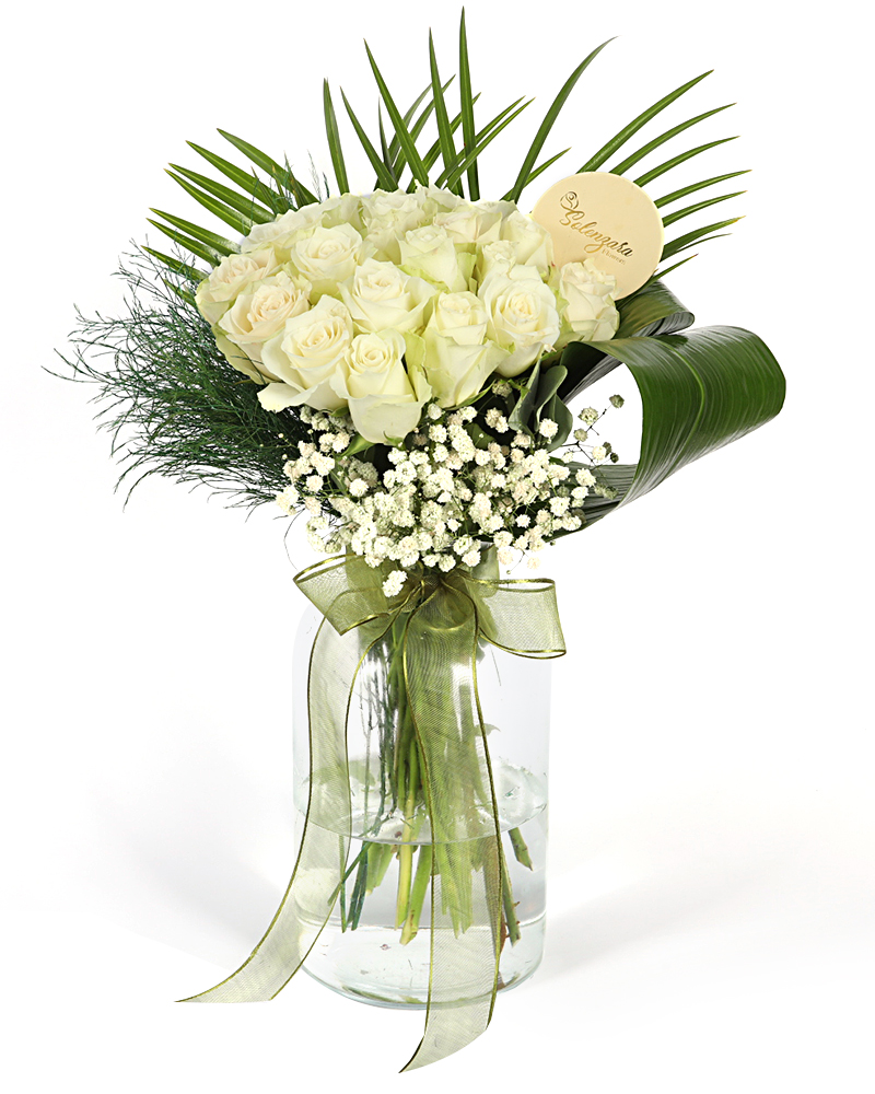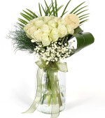 White ParisCam vazoda 20 adet beyaz-yeşil kenarlı eskitme görünümlü beyaz Gül, Cipso, Okaliptus, Fenix ve Boyalı.
